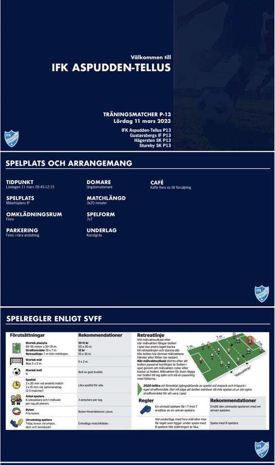 Info och uttagna spelare till lördagens fyra matcher är följande: Vi har enligt klubben tillgång till omklädningsrummen. Planen snöröjs och borstas snart efter att det slutat snöa. Bedömningen just nu är att vi spelar, skulle förutsättningarna ändras tar vi nya beslut och meddelar här som en nyhet i tid. Det är totalt ca 80st spelare ifrån fyra olika klubbar denna helg: IFK Aspudden Tellus, Gustavsbergs IF, Stureby SK, Hägerstens SK Plats: Mälarhöjdens IP, Lotta Svärds gränd 2, 129 55 Hägersten Match mot Gustavsbergs IF 1 Datum: 2023-03-11 Matchstart: 09:45 Samlingstid: 09:15 brevid plan Övrigt: Träningsmatch Spelform: 7v7 Matchlängd: 3*20 min Övrigt: utomhus, konstgräs Spelare: Benjamin Gill Gilbert Zadig Holger Isaksson Ian Malakuti Jacob Edelönn Odhammar Loa Mickias Alemayehu Otto Beik Sven Harry Morris ------------------------------ Match mot Stureby SK Datum: 2023-03-11 Matchstart: 09:45 Samlingstid: 09:15 brevid plan Övrigt: Träningsmatch Spelform: 7v7 Matchlängd: 3*20 min Övrigt: utomhus, konstgräs Spelare: Alfons Bergström Bjärbo Bill Hansen Elis Linder Jacob Ahlberg Josef Ahlberg Léon Barchini Lou Lindroth Gargallo Otis Jälmestål Rio Serén Valter Hagman ------------------------------ Match mot Gustavsbergs IF 1 Datum: 2023-03-11 Matchstart: 11:00 Samlingstid: 10:30 brevid plan Övrigt: Träningsmatch Spelform: 7v7 Matchlängd: 3*20 min Övrigt: utomhus, konstgräs Spelare: Elvin Frank Hanno Hult Hon Ming Wu Iker Arancibia Max Max Ekström Sandman Maxen (Max) Söderberg Noah Borgström Vilhelm Ahlgren Vincent Frisk Tengman ------------------------------ Match mot Hägersten SK Datum: 2023-03-11 Matchstart: 11:00 Samlingstid: 10:30 brevid plan Övrigt: Träningsmatch Spelform: 7v7 Matchlängd: 3*20 min Övrigt: utomhus, konstgräs Spelare: Ante Arthur Bagchi Cesar Mauro Klockar Erik Jergelind Nima Ingebretsen Hammarbäck Sam Einarsson Osvald Viggo Gummesson William