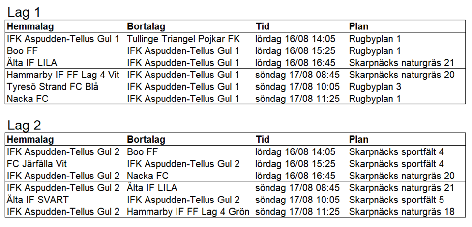 Hej Nu har vi spelshemat klart för Solnacupen på Järvastadens IP på lördag. Då vi inte riktigt har haft fullt mannskap har vi behövt pussla lite mellan lagen för att ha avbytare till alla matcher. Det är därför viktigt att du mycket noga kontrollerar vilka matcher just ditt barn ska spela. Se bifogad bild och längst ner i denna nyhet. Samling 30 minuter före matchstart vid angiven plan! Cupen spelas på Järvastadens IP. Matchtröjan på (det finns att låna) Benskydd på Vatteflaskan full Skorna ordentligt knutna Det ser ut att bli soligt och varmt. Mycket härligt med fint väder, men också viktigt att vi kommer ihåg extra mycket vatten och att vi påminner och hjälper spelarna att fylla på både energi och vätska under hela dagen. Om vi behöver komma i kontakt med varandra under dagen nyttjar vi lagchatten i WhatsApp. Som vanligt är det vi ledare som coachar spelarna och ni föräldrar hejar på från andra sidan planen! Vi ses på lördag! /Ledarna 9:40 J6 gul 1 Isaac Rindegren Tom Lannhagen Oliver Huss Nikolaj Mijac Arian Ebadian Oscar Röja Löwenberg Knut Edgren 11:00 J5 gul 2 Isaac Rindegren Stellan Sundberg Roy Sundberg Harry Årnäs Love Hein Ailo Gjengedal August Winter 11:00 J7 gul 3 Tom Lannhagen Winston Ryttberg Ericsson Henry Andersers Lindberg Love Leandertz Adam Hayyoun Oray Pekel Knut Edgren 11:40 J7 gul 1 Isaac Rindegren Tom Lannhagen Oliver Huss Nikolaj Mijac Arian Ebadian Oscar Röja Löwenberg Henry Andersers Lindberg 13:00 J6 gul 2 Stellan Sundberg Roy Sundberg Harry Årnäs Love Hein Ailo Gjengedal August Winter Nikolaj Mijac 13:00 J8 gul 3 Winston Ryttberg Ericsson Henry Andersers Lindberg Love Leandertz Adam Hayyoun Oray Pekel Knut Edgren Oliver Huss 13:40 J6 gul 1 Oliver Huss Nikolaj Mijac Arian Ebadian Oscar Röja Löwenberg Harry Årnäs Love Hein August Winter 14:20 J5 gul 2 Stellan Sundberg Roy Sundberg Harry Årnäs Love Hein Ailo Gjengedal August Winter Arian Ebadian 14:20 J7 gul 3 Winston Ryttberg Ericsson Henry Andersers Lindberg Love Leandertz Adam Hayyoun Oray Pekel Knut Edgren Oscar Röja Löwenberg
