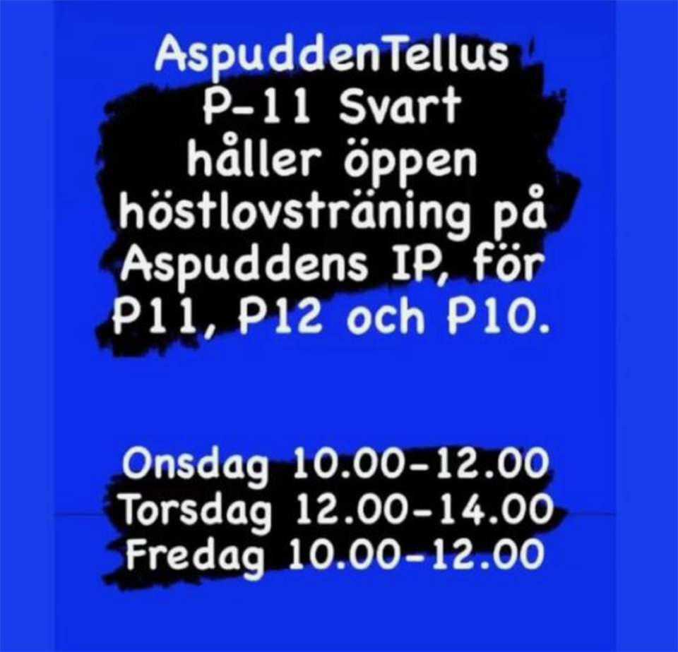 P11 svart bjuder in våra spelare till höstlovsträning på Linnea, Aspuddens IP- Det är bara att dyka upp i tid och säga att man tillhör oss P12 röd. Onsdag kl. 10.00-12.00 Torsdag kl. 12.00-14.00 Fredag kl. 10.00-12.00 Välkomna /Ledarna i P11 svart P2012 Röd 29 okt 2023