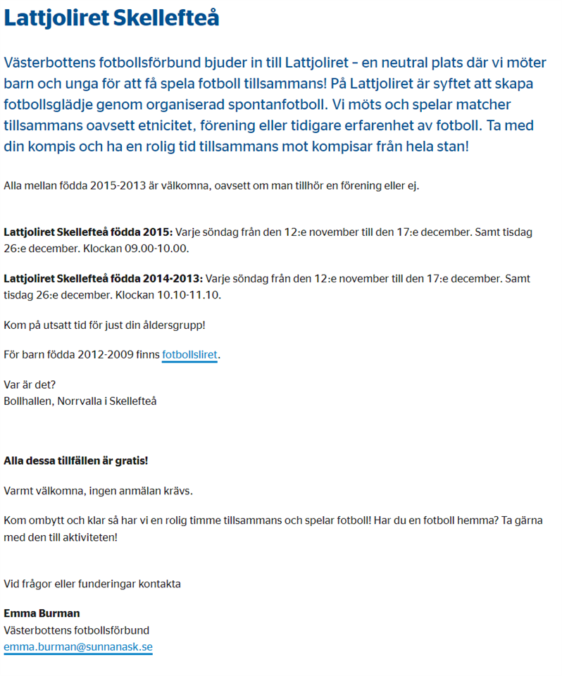 Hej! Här kommer ett erbjudande från Västerbottens Fotbollsförbund för alla fotbollsintresserade killar och tjejer som vill spela spontanfotboll fram till jul. https://vasterbotten.svenskfotboll.se/spelare/lattjoliret/fotbollsliret-skellefte/ Mix 15 31 okt 2023 0kommentarer