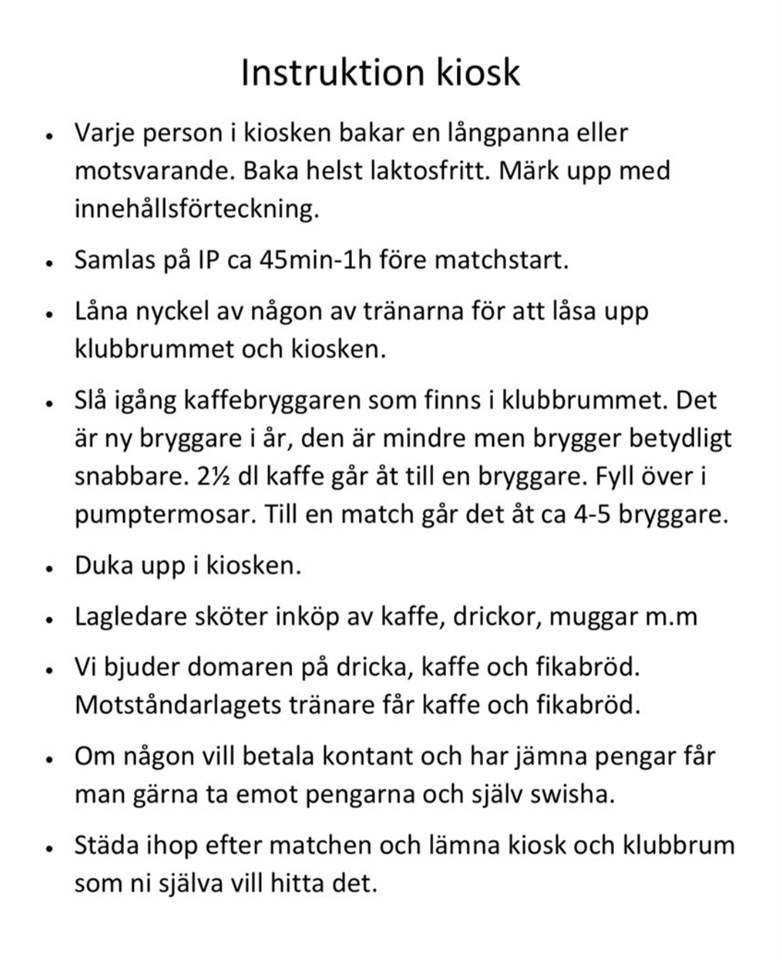 Inför sommaren så har vi några uppdrag till er föräldrar, bland annat så har vi en seniormatch där vi ska ha 3 st som står i fiket och sköter matchklocka och sen till våra egna matcher ska det finnas två personer i kiosken. Jag har slumpmässigt lottat ut vem som får göra vad. Är det så att man inte kan får man själv kolla om någon kan byta dag. Viktigt för dom som har seniormatchen är att läsa igenom dokumentet som finns under "dokument" i menyn. 9 Juni Seniormatch 12.30 Ayla Doris Alice K 15 Juni 13.00 Mindy Jolie 4 augusti 14.00 Ailin Wilma 10 augusti 15.00 Hollie Sigrid H.S 24 augusti 14.00 Elsa Irma 25 augusti 10.30 Sally H Majjas F-14 27 maj 2024 12kommentarer