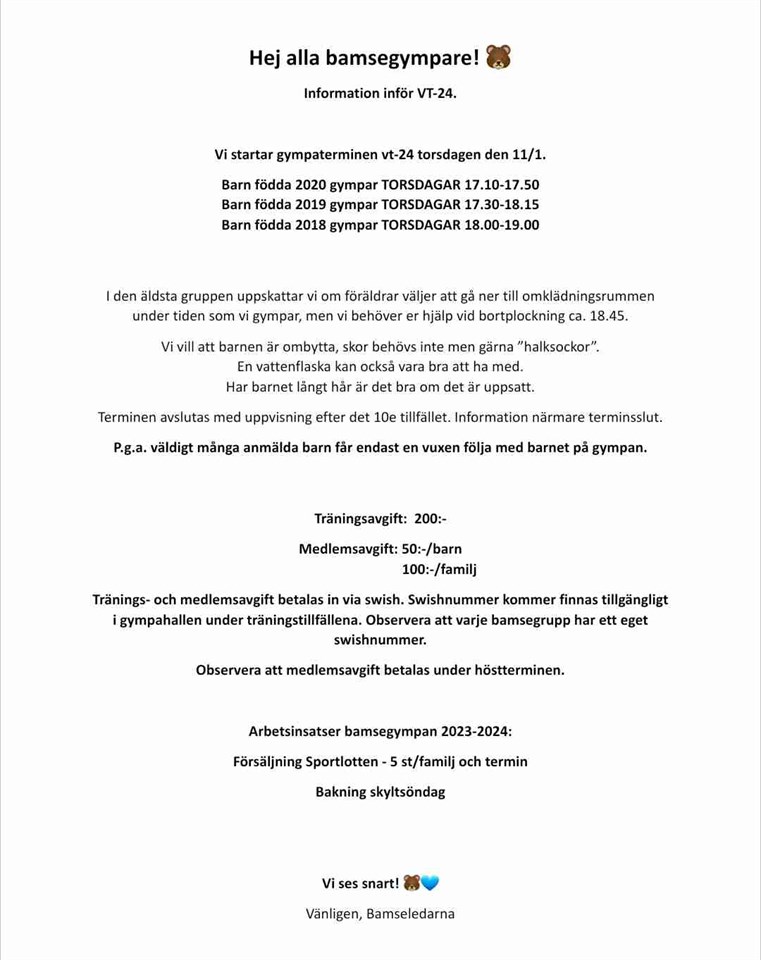 Hej alla gympaföräldrar! Nästa termin Bamsegympa startar torsdagen den 11 januari kl 17:30. Ingen anmälan krävs inför vårterminen, de barn som vill fortsätta är välkomna. 10 tillfällen under terminen med uppehåll för sportlovet. Under vårterminen säljer vi även Sportlotten. Styrelsen vill veta vad alla medlemmar tycker om att sälja Sportlotten som alternativ till krattning. En enkät kommer ut inom kort. Föreningen har beslutat att vi ska använda Laget.se för informationsspridning, information kommer därmed fortsättningsvis att skickas ut här. Vi hoppas att ni får en mysig jul! Vi ses till terminsstarten. 💙 Bamsegympa -19 17 dec 2023 0kommentarer