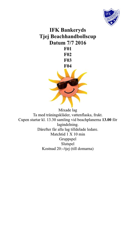 Äntligen är det dags för några härliga dagar med beachhandboll i Åhus! Här kommer lite information som kan vara bra att veta inför helgen. Samling vid Furuboda Folkhögskola, Furubodavägen 247, Yngsjö Lördag 16/7 Kl. 16.00 (restid ca 3 timmar). Vi inkvarterar oss och åker och tittar på PF05. På kvällen grillar vi korv- föräldrar som vill är välkomna att vara med. Utrustning: lakan, kudde, handduk, matchstället, lagjackan, IFK-overall, beachstrumpor, keps, ombyte m.m. Mat: frukost ingår i boendet, resten av måltiderna bekostas själva. Spelschema finns på hemsidan Åhus Beachhandboll, det finns också en app, Åhus Beachhandboll Festival där man också ser spelschema och kan följa resultat. Vi kommer ev. behöva lite assistans med körning mellan boende och spelarenan. Söndag kväll äter vi något ihop - spelare & föräldrar, detta planeras på plats. Nu laddar vi för kvällens träningsmatch och sen ses vi i Åhus på lördag! Hälsningar Ledarna