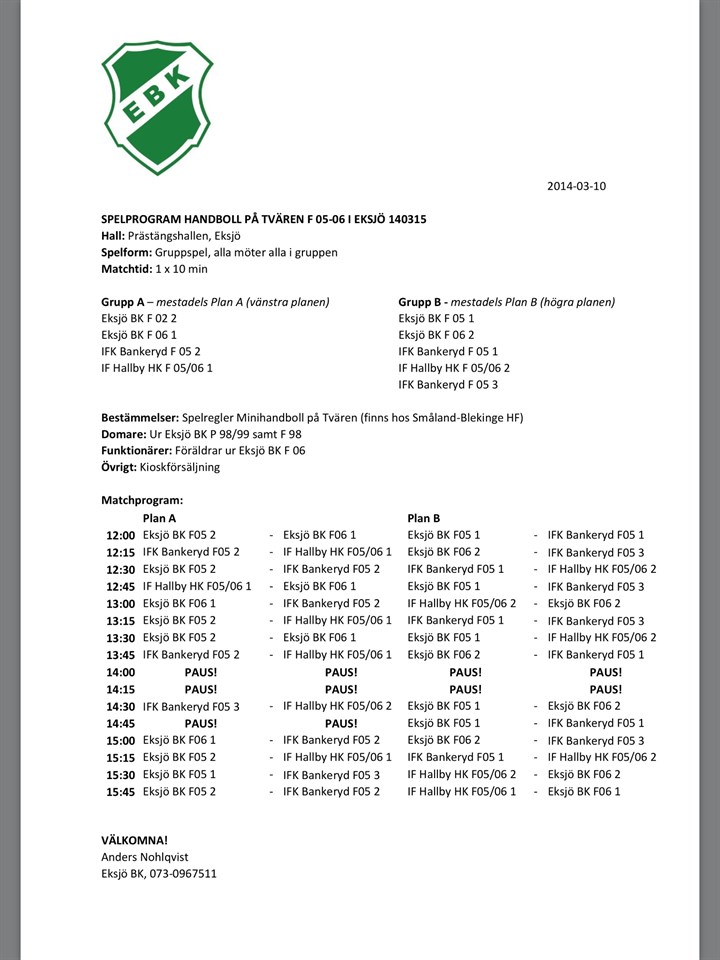 På lördag samlas vi 10:00 vid Attarpshallen för gemensam avfärd mot Prästängshallen i Eksjö. Vi kommer spela med 3 lag och möter lag från Eksjö och Hallby. Ta med matsäck för hela dagen, handbollsskor, kämpaglöd och vattenflaska. I bifogade bild ser ni spelschemat och tider för dagen. Vi syns! Tränarna IFK Bankeryd F05 F17/19 (födda 2003-2005) 12 mar 2014 0kommentarer