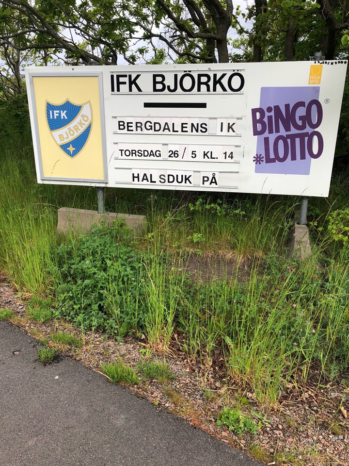 …la nu målen hauwla in. Björkö Björkö Björkö Hemmamatch på Björkövallen en torsdag hör inte till vanligheterna men då just denna torsdagen var Kristi himmelsfärdsdagen kunde matchen visslas igång redan klockan 14.00 denna blåsiga eftermiddag. Vinden kom från väst vilket gjorde att den blåste i planens längdriktning och gav lagen varsin halvlek i med- respektive motvind. För motståndet stod Bergdalens IK från Borås som inlett serien på ett bra sätt med hugg på topplagen. Scoutingrapporterna inför pratade om att Bergdalen har många bollskickliga spelare och ett bra grundspel som är svårt att läsa. Känslan i de gröna laget var inför god trots föregående omgång där Björkö kammade 0 borta mot IK Tord. Jack Olsson som var tillbaka i matchtruppen var ute och kände på planen inför match och utlåtandet blev ”Planen är riktigt go med perfekt fuktighet”. Således fanns alla förutsättningar för en fin match. Björkö fick börja i stark medvind och kunde med hjälp av vinden trycka ner bollen mot och bakom Bergdalens backlinje för att skapa tryck mot motståndarnas mål. Krister Körm ute till vänster på Björkös mittfält såg spelsugen ut inledningsvis och hotade Bergdalens högerback ett par gånger. Efter ca 10 minuter lyckas Körm ta sig runt på sin vänsterkant, in i straffområdet och väljer att slå in bollen hårt efter backen. Målvakten hinner knappt reagera och får den på sitt vänsterben varpå bollen studsar ut och där står Erik Alexandersson. Ny bollstuds och bollen går in i det tomma målet fram till 1-0. Supporten Victor Granstav som stod vid sidan om passade på att rasta hundarna strax efter detta och informerade övriga runt omkring att nästa mål kommer om 10 minuter. Som Granstav informerade kom 2-0 efter 20 minuter och det kom efter en frispark ute till höger utanför straffområdet. Andreas Odersjö kunde lägga upp bollen och sikta in sig. Hård låg boll mot bortre stolpen och skottet blockerades men inte bättre än att den letade sig fram till Erik Alexandersson vid bortre stolpen som enkelt kunde göra sitt andra för dagen. Bergdalen är ett skickligt lag och hade en del finurliga kombinationer i första halvlek. De lyckas dock inte riktigt skaka fram de riktigt farliga chanserna bortsett från en gång då de sågar sig fram till en chans som efter lite studsar ramlar ut till en röd spelare som drar den stenhårt i insidan stolpen och ut. Björkö tvingas till två byten i första halvlek där Amadeus Strandell fick byta av Buster Botters och Jack Ahlberg fick ersätta Krister Körm. 35 minuter in i halvleken är Theo Kornbakk på väg igenom men en röd mittback lyckas med en glidtackling och får bollen ut mot Björkös vänsterkant där Ahlberg kommer flygande och tar med bollen ner mot kortlinjen. Bollen spelas in i mitten och där får Erik Alexandersson brottas med tre Bergdalenbackar och en målis. Segrande i denna kamp gick Björkös gladiator Erik och 3-0 var ett faktum. Hattarna flög in på planen för att gratulera tremålsskytten och de gröna supportrarna mådde riktigt bra i solen. Studsarna hade hittills i matchen varit på Björkös sida och även om Björkö haft ett övertag kändes 3-0 som något mål i överkant just då. Sen bränner Björkö ett par riktigt vassa chanser under kommande 10 minuter innan halvlek där bland annat Bergdalens mittback delade ut en julklapp till Theo Kornbakk som fick komma helt fri men dessvärre räddades avslutet av de rödas keeper. Med bara någon minut kvar kom en reducering av Bergdalen där en fin boll letade sig in bakom Björkös backlinje och ett friläge för en forward. En briljant räddning av Björkös G i kassen hamnade bollen hos nästa forward som lyckades rulla in bollen i mål. Sen hinner Bergdalen få ett mål bortdömt innan pausvilan och det domslutet var inte ledarstaben i bortalaget helt nöjda med. Känslan in i paus hos hemmalagets supportrar var orolig. Från att gått från stabila 3-0 till att nästan vara reducerat till 3-2 de sista minutrarna och nu skulle det spelas i motvind. Som Janne G uttryckte det, ”det kan nog bli en riktig jobbig halvlek som kommer så det hade varit gött att ha åtminstone 2 till upp”. Andra halvlek ägnas mera åt att försvara sin ledning för de gröna och de gör detta med bravur. Bergdalen försöker ofta hota in bakom men backlinjen i de gröna har bra koll på de flesta försöken. Björkö försöker i sin tur sticka upp ett antal gånger och vid ett sånt tillfälle lyckas Kornbakk slita sig loss och får bollen serverad i ”slottet” runt straffområdeslinjen och kan distinkt trycka in Björkös fjärde mål för dagen. Bergdalen kommer till en del farligheter och inspel från kanterna men reducering dröjer och inte förrän med ca 10 kvar lyckas ett inspel hitta rätt och 4-2 är ett faktum. Björkö håller ihop laget bra efter detta och lyckas själva skaka fram ytterligare någon chans för ett femte men resultatet stannar vid 4-2 och återigen bevisar de gröna att man är starka på vallen. Segersång och kepsutdelning följde och det är svårt att runda Erik Alexandersson i en sådan utnämning som med tre mål, en assist och ett i övrigt föredömligt arbete över hela banan visar vägen mot seger. ”Bollarna studsar rätt idag men det är inte ett orättvist resultat. Vi är starka hemma” säger tremålsskytten. Ny match redan på måndag då vi ska ta oss till Hovgården och möte med IK Zenith och bekantingen Joakim Olsson som framgångsrikt tränar ett nytt grön vitt lag. Både 2- och 3-0 målet lyckades den briljante ungdomsledaren Håkan Svensson fånga på film så vill man kika på dessa hänvisas till appen MinFotboll. Här va de livat, här va de glatt! Här va de blommor i morsans hatt!