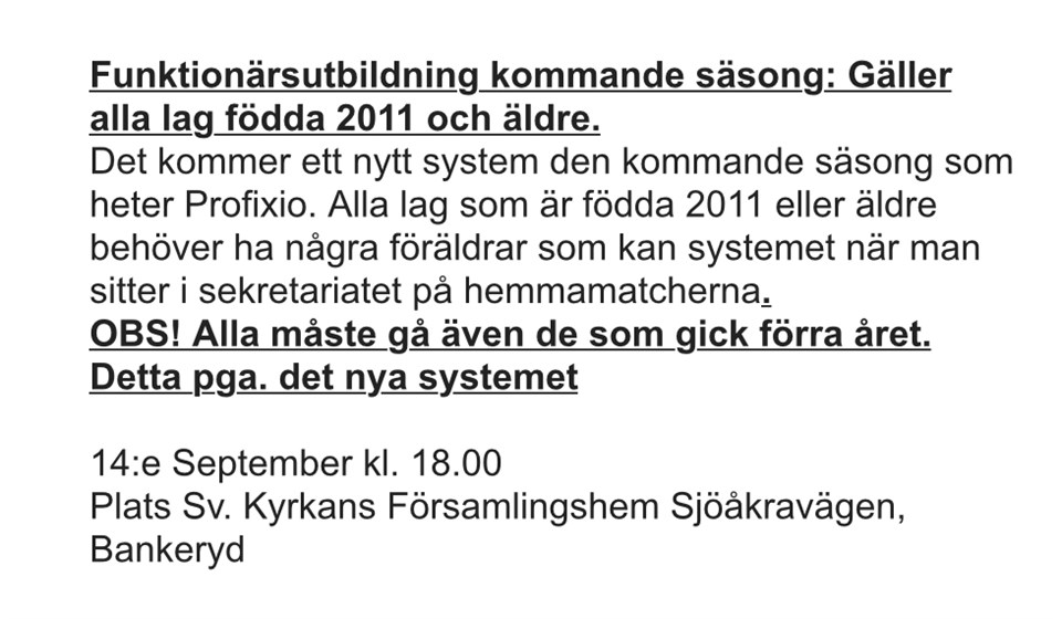 IFK Bankeryd Vi ber er alla att hjälpas åt att fylla på med domare, i år får killar födda 2010 börja döma matcher och tjäna lite extra pengar för sin insats. Information Föreningsdomarutbildning: Vi skickar i år ut en inbjudan till ledare, föräldrar och spelare. Alla som vill döma är välkomna, vi ser gärna att föräldrar och ledare blir domare. Vi vill att ni alla hjälps åt med att anmälan kommer in. Domarutbildning kommande säsong: Gäller nya och befintliga domare. Dvs alla födda 2010 och äldre. Även föräldrar/ledare som vill döma. Vi håller på och sätter datum för domarutbildning i IFK Bankeryd. Har ni någon kompis som inte dömer idag men som ni vet vill eller som kan passa bra. Ta gärna med den kompisen på utbildningen. Tillfälle 1: 13:e September kl 18. Länk till webbanmälan:https://educationwebregistration.idrottonline.se/home/index/1786803 Tillfälle 2: 18:e September kl 18. Länk till webbanmälan:https://educationwebregistration.idrottonline.se/home/index/1786804 Man är med på ett av tillfällena. OBS. Anmäl på länkarna. Ansvarig för domare i föreningen är: martin.z.andersson@teliacompany.com eller 0703-87 87 05.