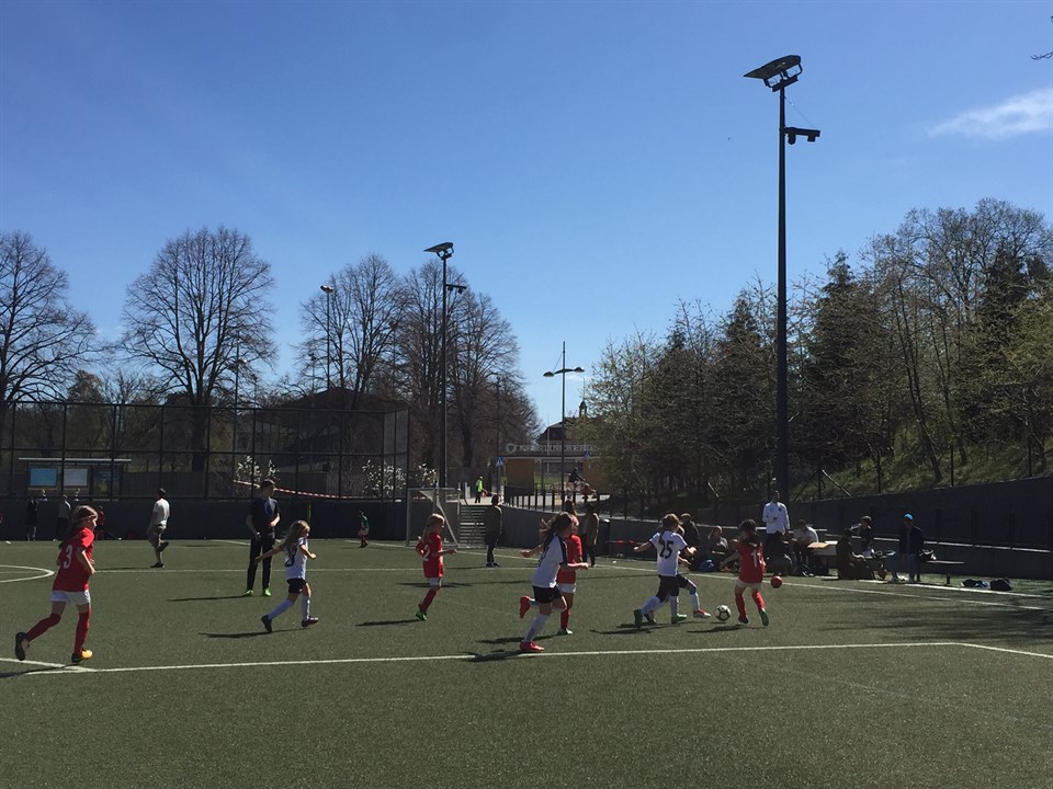 Endast fem flickor kämpade idag för IFK Bergshamra när vi mötte BK Karlberg på Kungsholmen, årets första sommardag. Tjejerna tvingades först vaska fram en målvakt fast ingen kände sig manad - vad härligt att tjejen som till slut stod i mål trivdes där och var väldigt nöjd med alla sina räddningar! Det var ett väldigt samspelt gäng som försvarade och anföll om vartannat och skapade massor av målchanser. Se bild nedan för exempel på snyggt anfall! 40 minuters intensivt springande i gassande sol! Dessutom till tonerna av Avicii som spelades på hög volym. Vi lånade idag in en spelare eftersom matchen annars varit svår att genomföra. Linnea kände sig väl mottagen av vårt fina gäng och bidrog direkt till den goda stämningen. 5-2 vann vi till slut med! F10 5 maj 2018 1kommentar