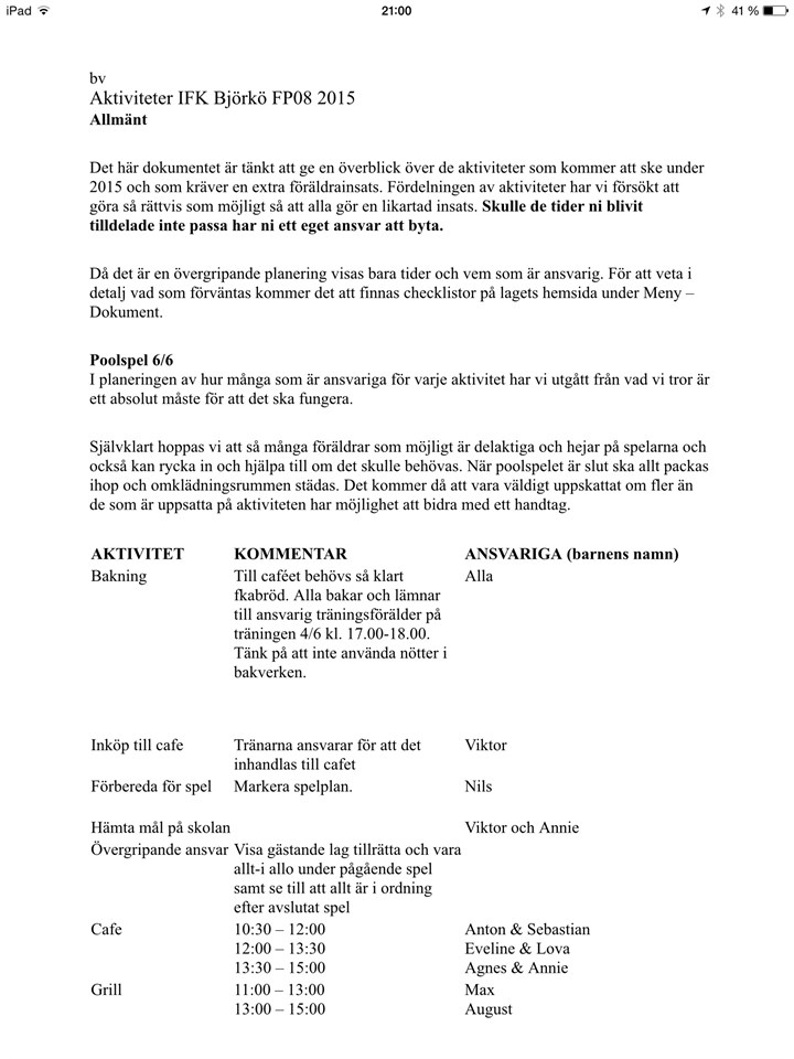 Hej Sedan tidigare mailad ansvarsfördelning finns på laget.se Sebastian/Agnes är inte med så vi får försöka pussla ihop två pass i caféet. Jag hoppas att vi kan lösa det den aktuella dagen Tränarna Fotboll F-07/08 30 maj 2015 0kommentarer