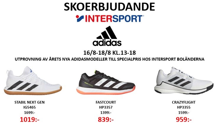 UTPROVNING AV ÅRETS NYA ADIDASMODELLER TILL SPECIALPRIS HOS INTERSPORT BOLÄNDERNA 16/8 - 18/8 kl.13-18 Modeller: STABIL NEXT GEN IG5465 Ord. 1699:- Nu. 1019:- FASTCOURT HP3357 Ord. 1399:- Nu. 839:- CRAZYFLIGHT HP3355 Ord. 1599:- Nu. 959:- /Intersport A-lag Herr 9 aug 2023 0kommentarer