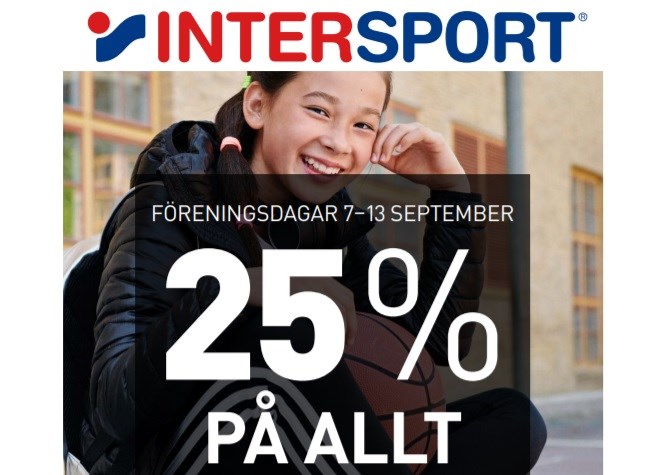 Exklusivt erbjudande till alla våra medlemmar! Den 7–13 september önskar vi alla medlemmar välkomna på exklusiva föreningsdagar hos vår samarbetsparter INTERSPORT! Som medlem får du 25% rabatt på allt i butiken*. Passa på att inhandla det senaste sportmodet och allt för en ny härlig idrottssäsong. Ta med den här inbjudan till någon av våra butiker eller visa upp den i din smartphone i kassan för att erhålla rabatten. Du kan också använda rabattkoden FÖRENING25 på intersport.se. Välkommen till din närmsta Intersportbutik eller intersport.se! *Erbjudandet gäller 7–13 september på ord.pris, dock ej på presentkort, hockey, bandy, elektronik, cyklar, träningsmaskiner, studsmattor, Hövding, Thule, golf, föreningskläder/teamkläder eller beställningsvaror.