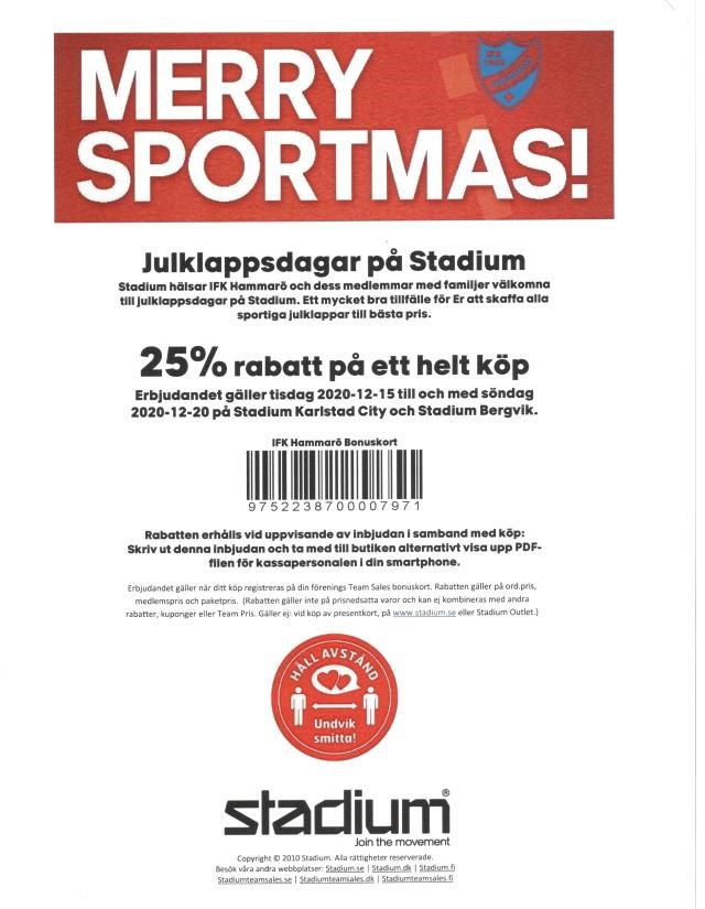 Hejsan! Stadium vill önska Er medlemmar en God Jul genom att ge Er en julkupong som ger 25% rabatt på ett helt köp. Kupongen gäller 15-20/12 i City-butiken och på Bergvik. Alla köp som görs med denna kupong är bonusgrundande för föreningen. Med andra ord = Fria bonuspengar till föreningen! Kupongen skrivs ut eller visas upp som PDF i smartphone i kassan. Finns även utskrivna rabattlappar på bordet på kansliet fr.om dag! OBS! Vi vill uppmana alla att hålla avstånd och inte besöka butiken om man känner sig minsta krasslig. Då detta inte är en kampanj som görs centralt kan den inte göras digitalt, utan denna gör vi tillsammans med butikscheferna på Bergvik och i City unikt för er. God Jul! Erik Forsberg Stadium Team Sales Damer veteran 8 dec 2020 0kommentarer