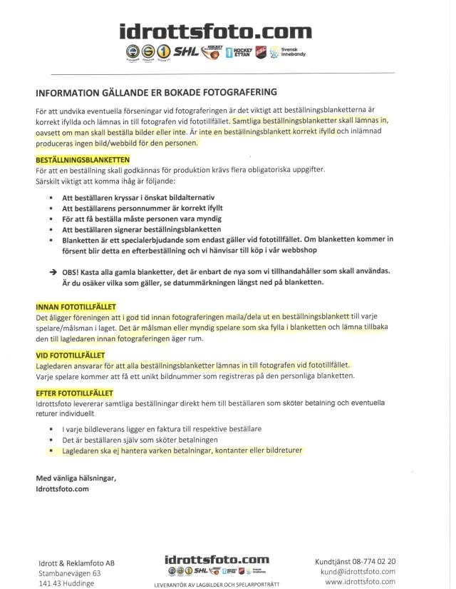 Hejsan! Nu är det dags att förvarna Er om lag/profilfotografering. LÄS INFO! Detta kommer att ske tisdagen 24 nov från kl 17.00, för alla lag! Så planera in dagen så att Vi blir så många som möjligt på fotona på kansliet... Blanketter delas ut så snart dem kommer.... ALLA aktiva/föräldrar MÅSTE fylla i blanketten oavsett om man ska ha foton eller inte! Påminnelse kommer när det närmar sig. Ha det gott! IFK Hammarö
