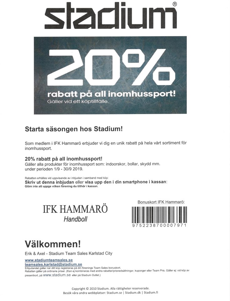 Starta säsongen hos Stadium! Som medlem i IFK Hammarö erbjuder vi dig en unik rabatt på hela vårt sortiment för inomhussport 20% rabatt på all inomhussport! Gäller alla produkter för inomhussport som: indoorskor, bollar, skydd mm. under perioden 1/9 - 30/9 2019. Rabatten erhålles vid uppvisande av inbjudan i samband med köp: //Kanslisten