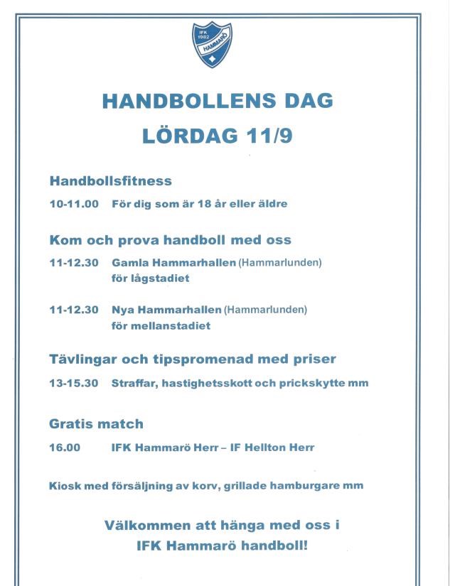 Hela Sveriges handbolls Kick-Off, innehåller aktiviteter för alla åldrar! Alla är hjärtligt Välkomna till Hammarhallarna/Hammarlunden!! Ps. Se info genom att klicka på bilden Ds. Handbollshälsningar IFK Hammarö Damer veteran 6 sep 2021 0kommentarer