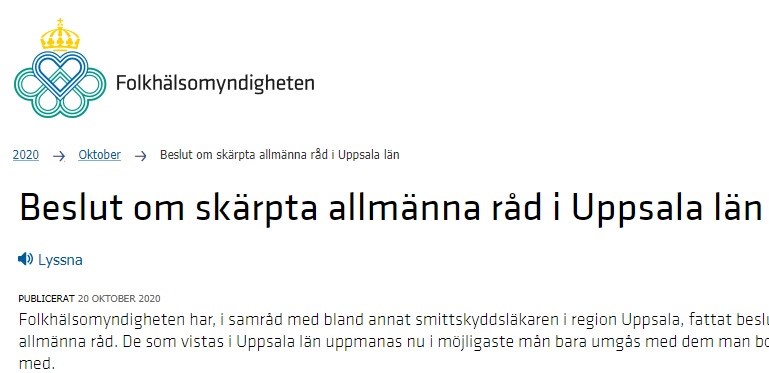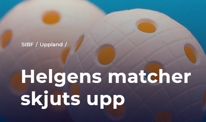 Från UIBF: "Samtliga innebandymatcher skjuts upp för föreningar inom Uppsala län. Det gäller matcher där minst ett av lagen tillhör Uppsala län och som administreras av Upplands Innebandyförbund eller GUD-distrikten. Matcher arrangerade av Svenska Innebandyförbundet är undantagna. Vi gör detta som en följd av de lokala restriktioner som införts och då vi har ett höstlov kommande vecka är antalet matcher betydligt färre än vanliga veckor. Detta innebär att en paus för matchspelet inte får betydande konsekvenser. Att efter 3 november fortsätta pausen skulle få betydande konsekvenser vilket innebär att avsikten är att starta upp matchspelet igen 4 november." Återkommer om hur vi gör med träningarna i helgen och kommande vecka.... /Ledarna Upplands Innebandyförbund FHM - Skärpta allmänna råd Uppsala län