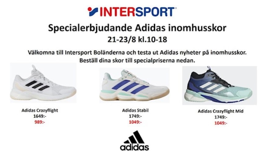 Välkomna till Intersport Boländerna och testa ut Adidas nyheter på inomhusskor! Beställ dina skor till specialpriserna nedan. Adidas Crazyflight 989:-(1649:-) Adidas stabil 1049:-(1749:-) Adidas Crazyflight Mid 1049:-(1749:-) Gäller för utprovning och beställning hos oss mellan 21-23/8 kl 10-18. Främst seniorlag och äldre ungdomslag är skorna rekommenderade för. INTERSPORT Boländerna Uppsala Rapsgatan 1B [www.intersport.se]www.intersport.se