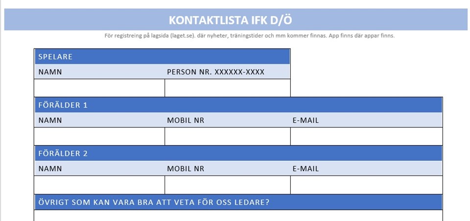 Nu finns en ny mall för kontaktupgifter för nya spelare upplagd under rubriken Dokument. Den innehåller även information om hur personnummer hanteras. Använd denna! /Styrelsen IFK D/Ö Styrelsesida 6 okt 2018 0kommentarer