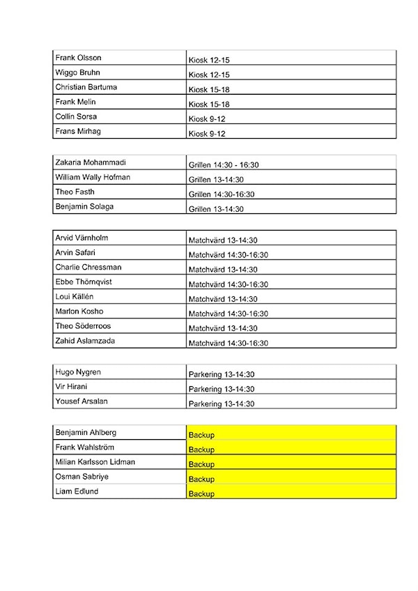 Vi har också försökt placera er som tidigare haft vissa uppgifter på nya platser så långt det varit möjligt. Några av er har dock inte fått en fast tilldelad plats utan kommer istället att vara backup, redo att hoppa in där det behövs under dagen. Eftersom detta är vårt första egna sammandrag är vi extra tacksamma för att ni finns till hands vid behov.
