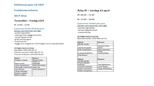 Hej! Bra uppslutning till de olika passen under Eskilstunacupen. Under fredagen är det väldigt många föräldrar anmälda, vilket är bra. Men prata ihop er med Anna Hoffstedt (Kaspers mamma) så att ni inte blir överflödiga. IFK vill att det ska vara "några" vuxna under fredagspasset. Ni som är reserver behöver självklart inte komma om ni inte har blivit kontaktade av någon som inte kan ta sitt pass. Kör hårt och lycka till!
