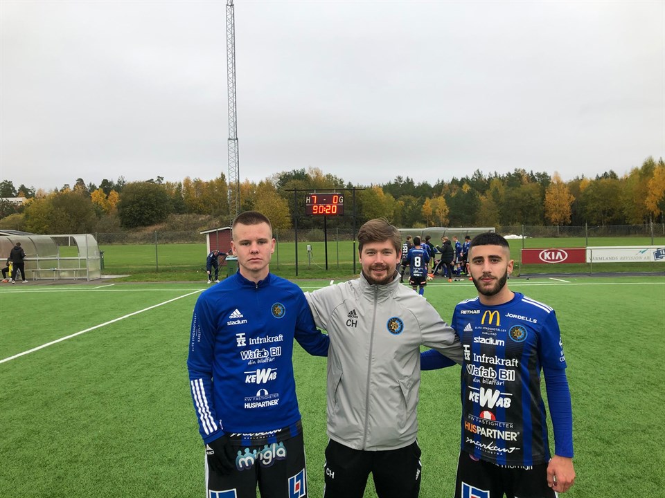 Säsongen för vårt P19-lag avslutades under lördagen på bästa sätt i och med segern mot FBK Karlstad. Därmed är vårt P19-lag klart för spel i Nationell P19-serie för säsongen 2021! Segersiffrorna skrivs till hela 7-0. Karlstad tar tag i matchen från början och gör både 1-0 och 2-0 ganska snabbt. Halvtidsresultatet stannar vid 3-0. Vi har mycket bra kontroll på matchen med bud på flera mål. I början av andra halvlek drabbades våra gäster av en utvisning vilket blev "början till slutet". Efter utvisningen var det inget snack och vi spelar ut på ett mycket bra sätt. Med bättre skärpa i avsluten hade vi kunnat göra ett antal fler mål. Stort grattis säger vi till hela laget och bra jobbat! På bilden ser vi vår fina tränare C-H Magnusson flankerad av dagens första målskytt, Johan Ågren, till vänster och dagens sista målskytt, Dler Mosa, till höger.