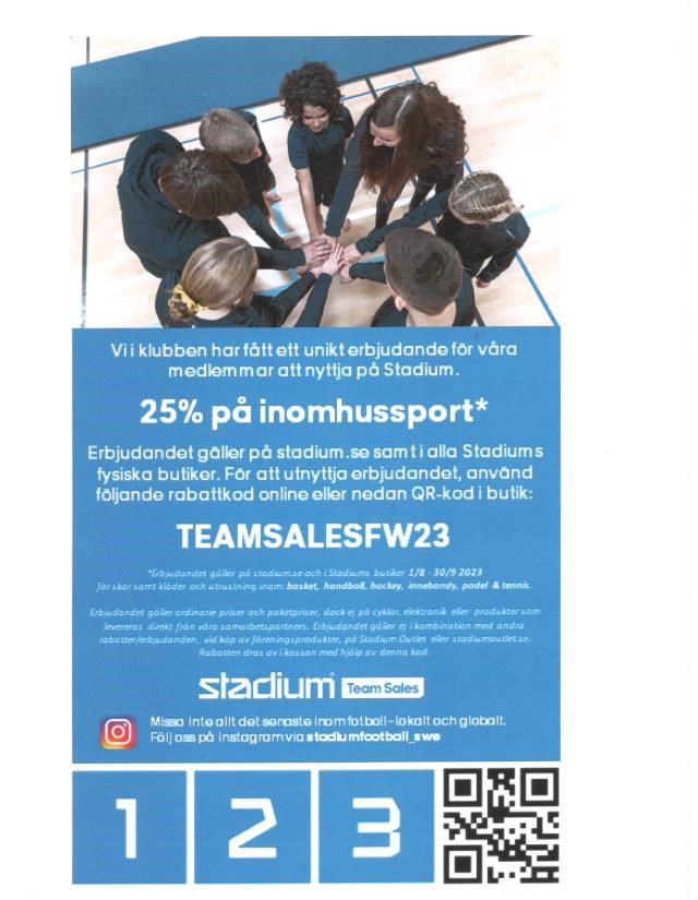 Hejsan! Nu är det dags för årets rabatterbjudande på handbollsprodukter för oss i föreningen! Vi har denna säsong en kupong som gäller till 30 sept-2023! Butikerna och stadium.se har börjat fått in säsongens nyheter (kommer fyllas på med fler modeller under september, och denna kupong ger Er medlemmar 25% rabatt på handbollsprodukter. Kupongen gäller både i butik och online. För beställningar på Stadium.se skriver ni in rabattkoden och/eller i butik visar ni upp kupongen i kassan. Klicka på bilden om Ni vill skriva ut kupongen! Rabattkod: TEAMSALESFW23 Kupongen registreras inte på föreningen utan de som handlar kan registrera köpet på sitt eget stadium-kort IFK Hammarö ber därför alla Er medlemmar att stödja just vår förening via ”Stöd din förening” så kommer även IFK gagnas av handeln som sker med kupongerna. Skynda fynda! Välkomna! Ps. Samtidigt vill vi såklart även pusha för medlemsprofilen som finns via stadium.se så vi får fler att klä sig både bra och snyggt i era föreningskläder! Dessutom ger det bra bonus till föreningen! Så klicka på länken: Medlemsprofilen (Sök fram vår egen förening för att länka rätt direkt) (Här har vi alltid Team pris och därför gäller kupongen inte på föreningsprofilen) Ds.