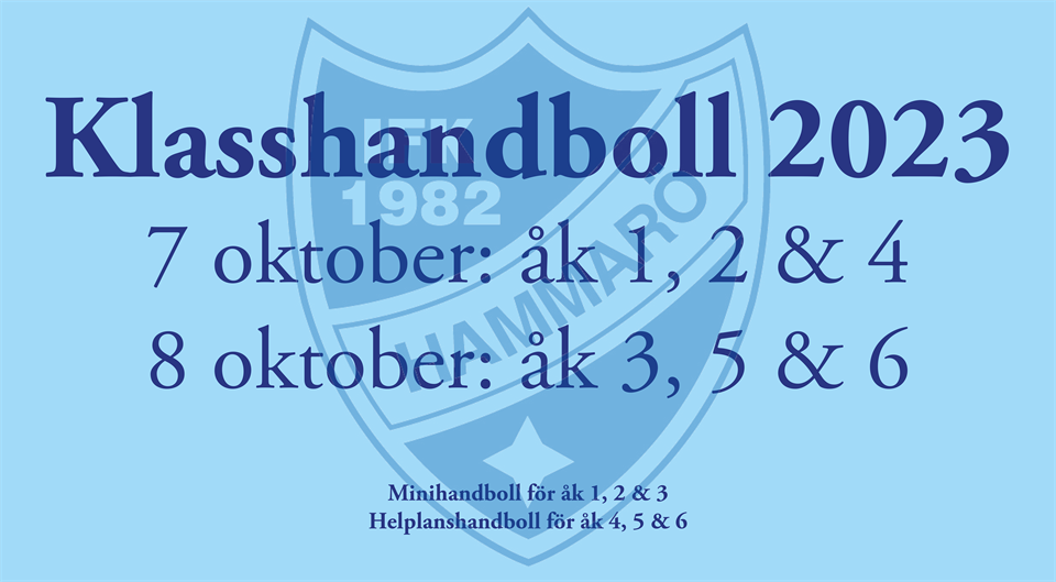 Äntligen! Förra höstens megasuccé, klasshandboll för låg- och mellanstadiet, är tillbaka den 7-8 oktober. Nu kan du anmäla dig. Anmälan till klasshandbollen 2023, klicka: HÄR Sista anmälningsdag: 11 september Lördagen den 7 oktober 2023 spelar årskurs 1, 2 respektive 4 och Söndagen den 8 oktober 2023 spelar årskurs 3, 5 respektive 6 Minihandboll Årskurs 1, 2 och 3 spelar minihandboll. Det innebär spel på mindre planer, från långsida till långsida. Här har laget fyra utespelare och en målvakt på planen samtidigt. Helplanshandboll Årskurs 4, 5 och 6 spelar på helplan med sex utespelare och en målvakt. Vi spelar handboll i båda hallarna (Hammarhallen A och Hammarhallen B). Anmäl dig, prata med klasskompisarna så de också anmäler sig, och IFK Hammarö pusslar ihop lagen så att alla får spela handboll. Förtydligande - skulle inte din klass få ihop tillräckligt med spelare så ordnar föreningen så att klasser med för få anmälda spelare slås samman och bildar ett blandlag. Alla som medverkar får, förutom en superrolig dag tillsammans med klasskompisarna, en egen klasshandbollströja och en vattenflaska. Mer information om samlingstider, matchtider och annat kommer skrivas ut här på hemsidan cirka en vecka före klasshandbollsfesten. Prova på handboll Lördagen den 16 september anordnas Hanbollens dag i hela Sverige. IFK Hammarö kommer bjuda in alla som vill prova på handboll till detta datum. Mer information kommer. Anmälan till klasshandbollen 2023, klicka: HÄR Sista anmälningsdag: 11 september VÄLKOMMEN! Vi är med och gör Klasshandbollen möjlig: Peab Bostads AB T3 Group Springbreeze Karlstad AB Björn och Fredriks Stensättning Invite Sport Involvus Menardi & Barth Recruiting AB Pizzeria Capri RS Ställningar AB Solskyddspartner Vendel & Dalin AB (stort tack till våra samarbetspartners)