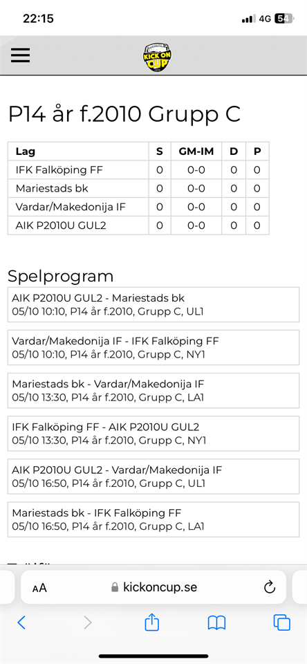 Hej! På tisdag spelar vi sista seriematchen hemma på Odenivi mot IFK Skövde. Kallelse kommer för de som ska spela matchen. På torsdag har vi träning och då blir det fokus på 11-manna inför Kick On Cup! Cupen går av stapeln i Tidaholm med omnejd 5-6/10. Gruppspel 3 matcher på lördagen (spelschema finns på https://kickoncup.se/games.php?cupID=5&yearID=25&teamID=502 ). På söndagen är det slutspel och matchschemat beror på hur det går i gruppspelet. Det finns till skillnad mot seriespelet inget max antal spelare vi får komma med till match men vi måste registrera laget och spelarna inför cupen varför vi nu med relativt kort varsel behöver veta vilka som kommer vara med och spela. Hoppas alla kan vara med! Kallelse är skickad, var snälla och svara på denna så snabbt som möjligt, senast imorgon kväll. Ledarna