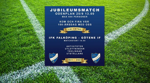 Hej alla, Den 25 september fyller IFK Falköping Fotboll 100 år. Det vill vi nu fira tillsammans med så många som möjligt på Odenplan. Vi gör det i samband med seniorernas seriematch mot Götene IF, Lördag den 25/9 kl. 14:00 på Odenplan. Det kommer vara gratis entré samt diverse aktiviteter. Samarbetspartners och utställare kommer att finnas på plats. O’learys kommer att ha försäljning av hamburgare och dricka som vi givetvis bjuder våra IFK ungdomar och ledare, klädda i blåvitt, på. OBS! Våra killar i P8 kommer att hämta ut sin mat tillsammans med killarna i P9 i andra halvlek (ca kl. 14:45). Vi hoppas att det kommer mycket folk till den här matchen och att vi tillsammans med er; ledare, våra ungdomslag, föräldrar, syskon, mor- och farföräldrar och alla andra får till en riktig fotbollsfest! Kom till Odenplan för att se matchen, visa ert stöd för vår förening och ta del av IFK Falköping fotbolls 100 års firande. Ta med fördel på er våra klubbkläder, träningsoverall eller matchtröja (blått o vitt) så skapar vi tillsammans ett ”Blåvitt hav” på och runt arenan. Det blir en fin och mäktig inramning när matchen sedan spelas med avspark kl 14:00. Låt oss tillsammans, på detta sätt, skapa ett minne, en föreningskänsla där vi tillsammans firar IFK Falköping Fotbolls 100 års dag! Entrén är öppen från kl 13:00. Väl mött till en förhoppningsvis solig och fantastisk eftermiddag på Odenplan!