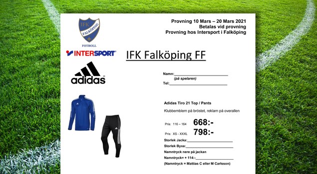 Nu kör vi igång med vårens prov- och beställningsomgång från klubbkollektionen, där en av nyheterna är träningsoverallen, Adidas Tiro 21, som kommer att finnas i sortimentet 2021–2022. Utprovning av kläder sker mellan den 10–20/3. Betalning sker vid beställning hos Intersport i Falköping. Klicka på länken för att se vad som finns att beställa: Klubbkollektion