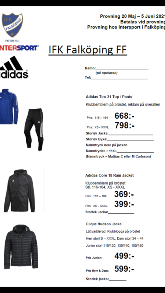 Med början 20:e maj fram till den 5:e juni kör vi en ny prov- och beställningsomgång av IFK:s klubbkollektion på Intersport. All betalning av beställda produkter görs till Intersport vid beställningstillfället. Nytt för 2021 är: • Ny modell på klubboverall som kommer vara under 2021-2022 • Väskor är Svarta i färgen i stället för blåa. (då Adidas inte har kvar den blå färg vi haft längre)