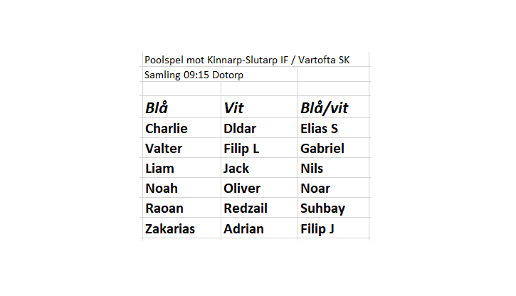 På grund av ett missförstånd med laget som ska döma vårt poolspel har vi inga domare tills på lördag. Vi provar därför att vända oss till er föräldrar som kan tänka sig att vara domare där det viktigaste egentligen är att hålla tiden (4x3), blåsa vid mål samt avspark. Vi behöver hjälp av tre stycken föräldrar (eller mormor/morfar?) för att vi ledare ska kunna fokusera på spelarna fullt ut. I annat fall får vi ledare döma. Intresserade föräldrar kan kontakta Jonas 0704332855 OBS ny tid för samling på lördag är 09:30