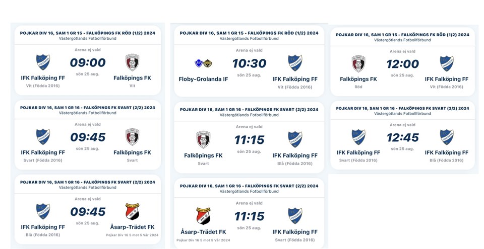Hej! Det har blivit dags för höstens första sammandrag som spelas på Falevi i Falköping hos våra stadsgrannar Falköpings FK. Lag Vit - ledare Richard Samling 08:30 Falevi Filip Lööv Jack Checko Elliot Thuné Zackarias Osman Ibrahim Hussein Oliver Tiverman Tunjic Raoan Ghani Lag Svart - ledare Pontus och Jonas Samling 09:15 Falevi Noah Lindkvist Liam Lindkvist Mille Karlgren Arham Khan Mohamed Ali Farid Valter Malmström Marti Osman Lag Blå - Valton och Himen Samling 09:15 Falevi Elias Stenberg Ishak Salcin Ahmad Dasoke Gabriel Ali Aryan Sadi Noar Gashi Aram Ahmad