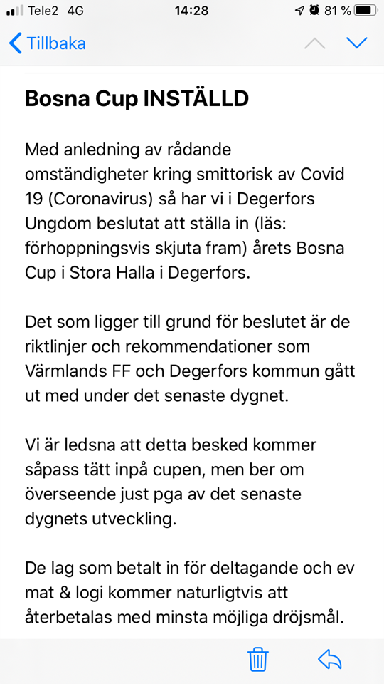 Hej alla tyvärr blir cupen i helgen inställd på grund av Corona. Jag fick precis Mail om detta. Mvh Putte P-06 12 mar 2020 2kommentarer