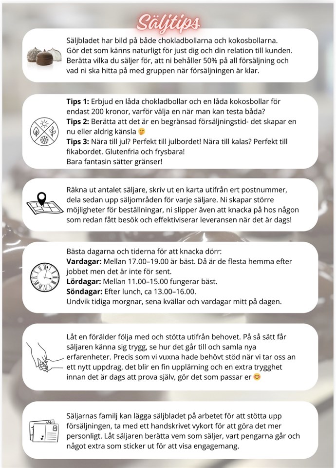 Varje låda innehåller 20 läckra kokostoppar eller chokladtoppar och kostar 100 kr, laget får 50 kr per såld låda! Säljtips finns i den bifogade bilden :)