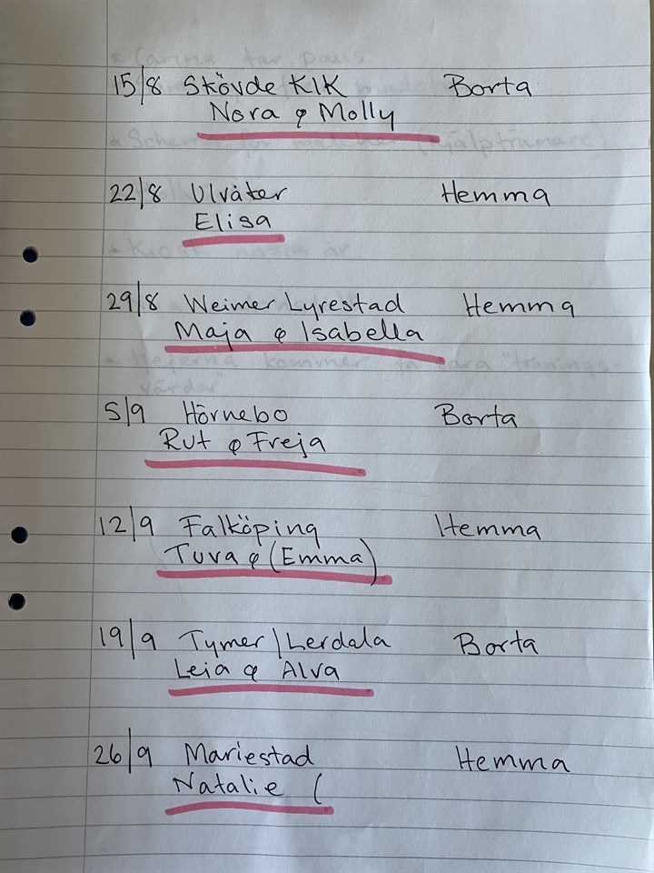 Vårt laguppdrag är att vara bollvärdar på damlagets hemmamatcher. Barnen ska hjälpa till att hämta bollar bakom målen. Vi tränare kommer inte att närvara, så de får ta kontakt med någon ledare/ kioskpersonal på plats, för att få västar och information om uppdraget. Samling ca.30min innan matchstart. Här nedan följer vilka barn som ansvarar vid vilken match. Byt med någon i laget om dagen inte passar. Söndag 29/8 14.00 Molly, Emma, Isabella, Alva Söndag 19/9 12.00 Tuva, Natalie, Freja + någon frivillig /Tränarna