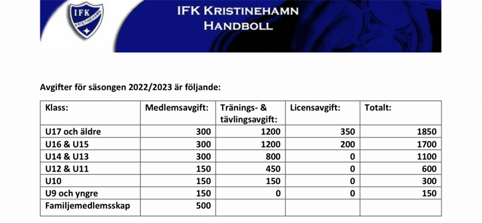 Hej! Betalas in till Plusgiro: 290580-0 - senast 31/10 2022 Ange spelarens namn, personnummer och lagnamn i meddelanderutan. I år spelar vi i F10, 10-årsserien. (U10) enligt listan. Denna säsong är det 150kr i medlavg och nytt är 150kr i spelaravgift = totalt 300kr Om du vill se hela dokumentet för medlems- och spelaravgifter hittar du det: HÄR Vi ses!