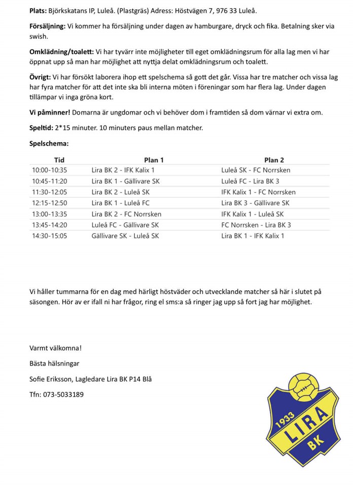Vi samlas 30 min före varje match. Matchställ: SVART Ha gärna någon tunnare långärmad tröja under, kan bli kallt. Även några underställsbyxor under shortsen efter väder. Bättre att vara för varm än för kall för att undvika skador. Ni har all info ni behöver i bifogat spelschema. Hör av er vid frågor. 070-845 81 07. Påminner även om onsdagens avslutning/ föräldramöte🎉 P-13/14 25 sep 2023 0kommentarer