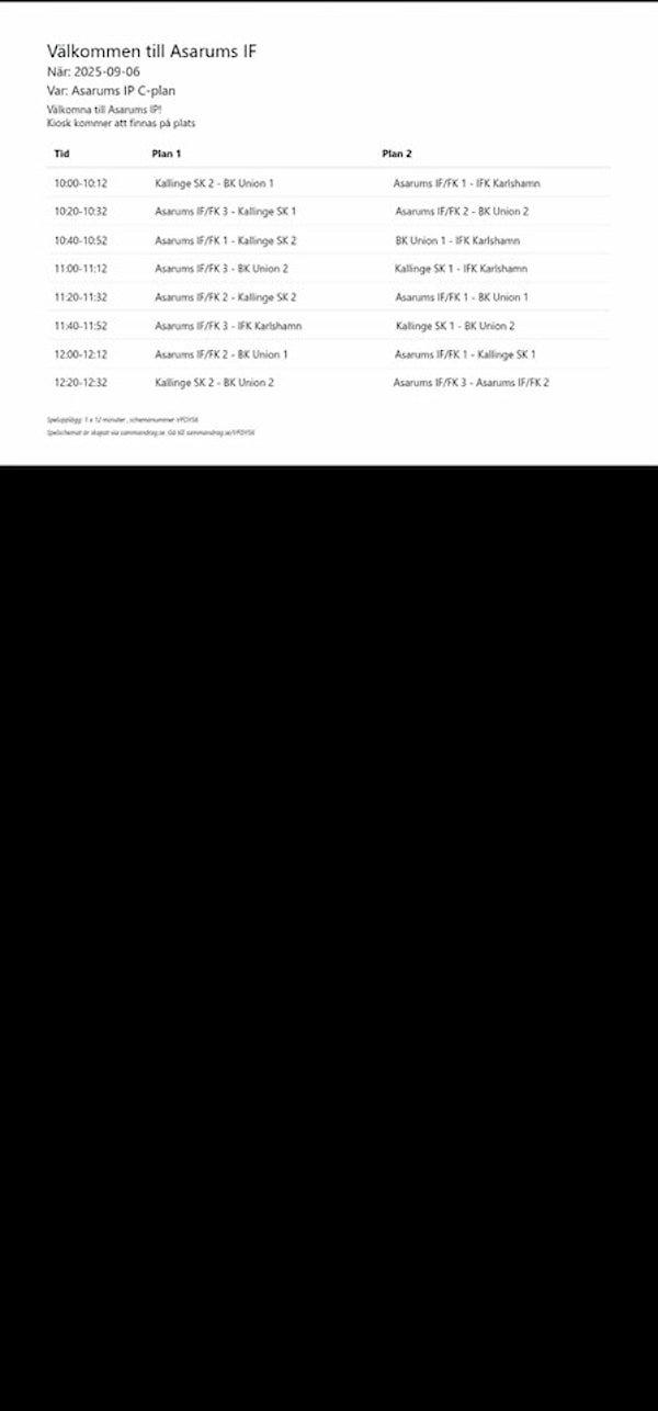 Samling 09:30 asarum ip ute utanför kiosken. Där byter vi om och tar oss sedan till c planen. Första matchen börjar 10:00