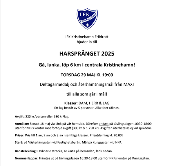 Härmed inbjuder IFK Kristinehamn Friidrott till årets upplaga av Harsprånget 2025.