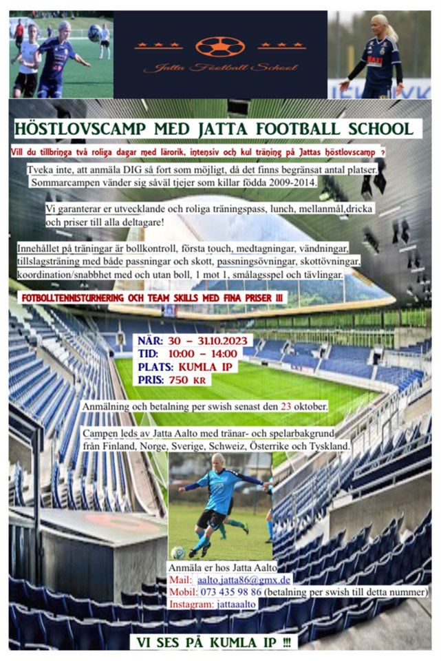 Jatta Aalto ordnar med ett fotbollscamp under höstlovet, se fil. Våra tjejer betalar 600 kr istället för 750 kr. F-15 13 okt 2023 0kommentarer