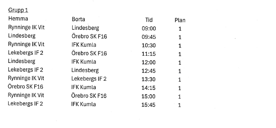 Hej, Efter en mycket trevlig dag i Mosås och bra spel av tjejerna så är det dags för nästa cupspel i Sköllersta på söndag. Vi kommer spela 4 matcher, 2 x 12 min. Första matchen är kl. 9.30 på plan B1 och sista 14.30 på plan B3 (se ovan bild). Se komplett spelprogram via följande länk till spelschema. Se till att tjejerna har med sig blåa strumpor och blåa shorts, matchtröjan delas ut på plats. De anmälda är: Melina, Ellen, Nila, Sigma, Elizya, Ines R, Elina, Olivia, Ines T-R, Stina, Louice och Ebba. Skulle någon få förhinder är vi tacksama att man meddelar det snarast. Samling kl. 9.00 på Sköllervallen. Nedan följer viktig information från arrangören: PARKERING & AVLÄMNINGSZON - Eftersom att antalet parkeringar vid idrottsanläggningen är starkt begränsade så uppmanas man i så stor utsträckning som möjligt samåka med varandra, och till en början parkera vid Sköllersta Skola, Handlar'n, Sköllersta Kyrka eller Lithells (5-15 min promenad). Det kommer finnas en AVLÄMNINGSZON på parkeringen vid grindarna utanför klubbhuset (sekretariatet) där man kan lämna av spelare/ledare för att sedan parkera vid något av ovanstående ställen. - All parkering vi erbjuder är gratis. - Det är INTE okej att parkera längs vägen. Detta för att inte hindra busstrafiken och fordon med bred last. PÅ SKÖLLERVALLEN - SERVERING - Det kommer att serveras grillade hamburgare, varmkorv, fika, kaffe, glass m.m. Glutenfria och vegetariska alternativ finns. - TOALETTER - Det finns toaletter i samtliga omklädningsrum, samt bredvid domarrummet i klubbhuset. Dessutom kommer det att finnas ett antal flyttbara toaletter utanför klubbhuset, och vid H-planerna. - BETALNING - All betalning på anläggningen sker via Swish. Vi tar alltså INTE emot kontanter/kort. Vi ses på söndag och hejjar fram tjejerna! /Admir, Tiho och Tom