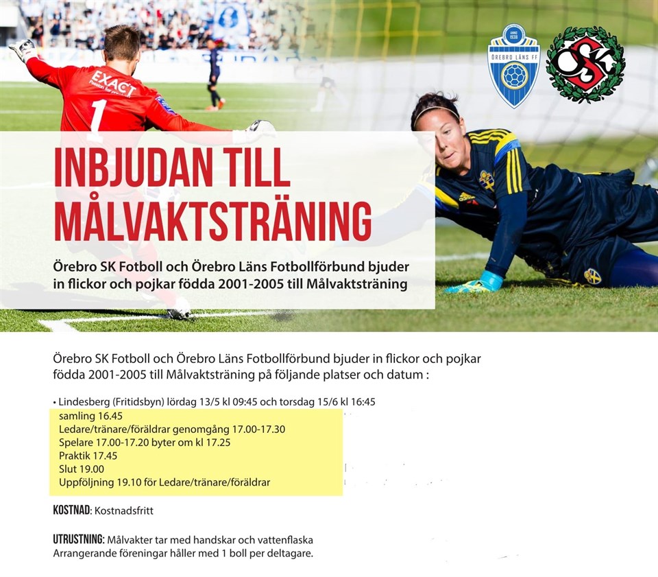 Hej! ÖLFF och ÖSK Fotboll driver tillsammans ett målvaktsprojekt med öppna målvaktsträningar för pojkar och flickor 12-16 år (födda 2001-2005). Målvaktspassen arrangeras i Hallsberg och Lindesberg och varvar praktik och teori, och målgruppen är såväl deltagare som ledare/föräldrar. De första tillfällena lockade över 40 deltagare. Nu är det dags för det andra tillfället. Vi vill poängtera att man inte behöver ha deltagit vid första tillfället för att nu få deltaga, utan ALLA intresserade deltagare i aktuella åldrar, samt alla intresserade ledare/föräldrar, är mycket välkomna! Hallsberg: Onsdag den 14 juni kl. 16.45. Lindesberg: Torsdag den 15 juni kl. 16.45. samling 16.45 Ledare/tränare/föräldrar genomgång 17.00-17.30 Spelare 17.00-17.20 byter om kl 17.25 Praktik 17.45 Slut 19.00 Uppföljning 19.10 för Ledare/tränare/föräldrar Anmälan med Namn - Födelseår - Förening - Mobilnummer till: marcus@olff.se F15/17/Dam LOK 8 jun 2017 0kommentarer