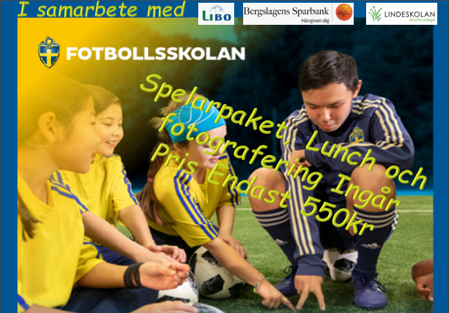 Välkommen alla tjejer och killar 6-12 år! Vi arrangerar Fotbollsskolan vecka 25, dvs måndag den 15/6 - torsdag den 18/6 mellan klockan 10:00-14:00. Anmälan sker via https://www.svenskfotboll.se/fotbollsskolan/ Fotbollsskolan kommer att ledas av speciellt utvalda och utbildade elever från Lindeskolans fotbollscollage, samt ev även spelare från IFK Lindesberg. Vi kommer att dela in barnen i lämpliga grupper efter ålder och förmåga där vi lär oss lira blågult och vara en schysst lagspelare och ha roligt med fotboll. För de yngsta barnen 6-7år skall minst en förälder vara närvarande under hela fotbollsskolan. Vill man veta mer om lira blågult och direktiven runt Covid-19 går man in på SVFF´s hemsida. Spelarpaket, lunch och fotografering ingår. Pris: Endast 550 kr 100kr i syskonrabatt. (gäller from anmälan av andra barnet) I priset ingår det "blågula" spelarpaketet samt lunch (husmanskost). (Viktigt!! För att garantera leverans av deltagarpaketen skall anmälan vara inne senast 29/5) Vi kan även ta emot senare anmälningar nån vecka till men kan då ej garantera leverans av kläderna. Det går även bra att ta med egen lunch om man vill, micro för uppvärmning finns. Spelarpaketet levereras till Team Sportia i Lindesberg och hämtas själv upp av deltagarna veckan innan vi drar igång. Vill man även beställa shorts och strumpor kan man göra detta själv på Team Sportia i Lindesberg, det blir då isf våra klubbkläder från Select och priser finns på vår klubbprofil på vår hemsida https://www.laget.se/ifklindesberg Kryssar man i extrabeställning av shorts och strumpor här levereras det i samband med spelarpaketet. (Priser finns under select klubbprofil på IFK´s klubbsida) Pga Covid-19 sätter vi deltagarantalet till max 50 och skulle direktiven ändras så att vi ej kan genomföra bollskolan kommer hela anmälningsavgiften betalas tillbaka. Eventuella övriga frågor kan besvaras av IFK Lindesbergs kansli. (mail: ifk.lindesberg@telia.com) Vi ses i sommar! Välkomna önskar IFK Lindesberg, Bergslagens Sparbank, LIBO, Idrottscollage Lindeskolan, och Team Sportia!
