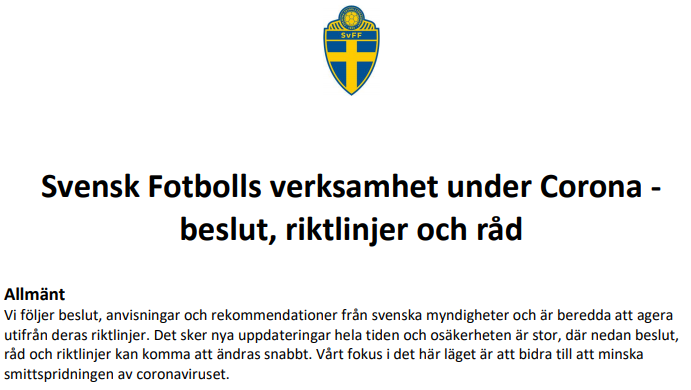 Svenska fotbollsförbundet (SvFF) har kommit ut med nya direkt på grund av situationen med Corona. Förbundets hållning är att situationen är allvarlig men att man följer berörda myndigheters direktiv. I nuläget finns förutsättningar för att genomföra träningar och att planera för ungdomsserier. Folkhälsomyndigheter har INTE gjort några uttalanden om inställda träningar. Tvärt om - de anser att det är viktigt att dessa fysiska aktiviteterna fortgår, för folkhälsans skull. Vill du läsa hela direktivet så finns det under: https://www.laget.se/ifklindesberg/Document IFK Lindesberg fortsätter att planera verksamheten utifrån direktiven från SvFF. Föreningen förstår också att situationen är exceptionell och att varje familj måste göra en bedömning vad som är rätt för respektive individ. (Kan tex finnas personer i riskgrupper i familjen, som gör att vissa spelare gör en paus.) Vid alla aktiviteter är det naturligtvis viktigt att alla tar ansvar för att minska risk för smittspridning. Tvätta händerna, hosta i armveck och fram för allt; stanna hemma om du är sjuk. Även efter att du blivit frisk, utifrån folkhälsomyndighetens riktlinjer.