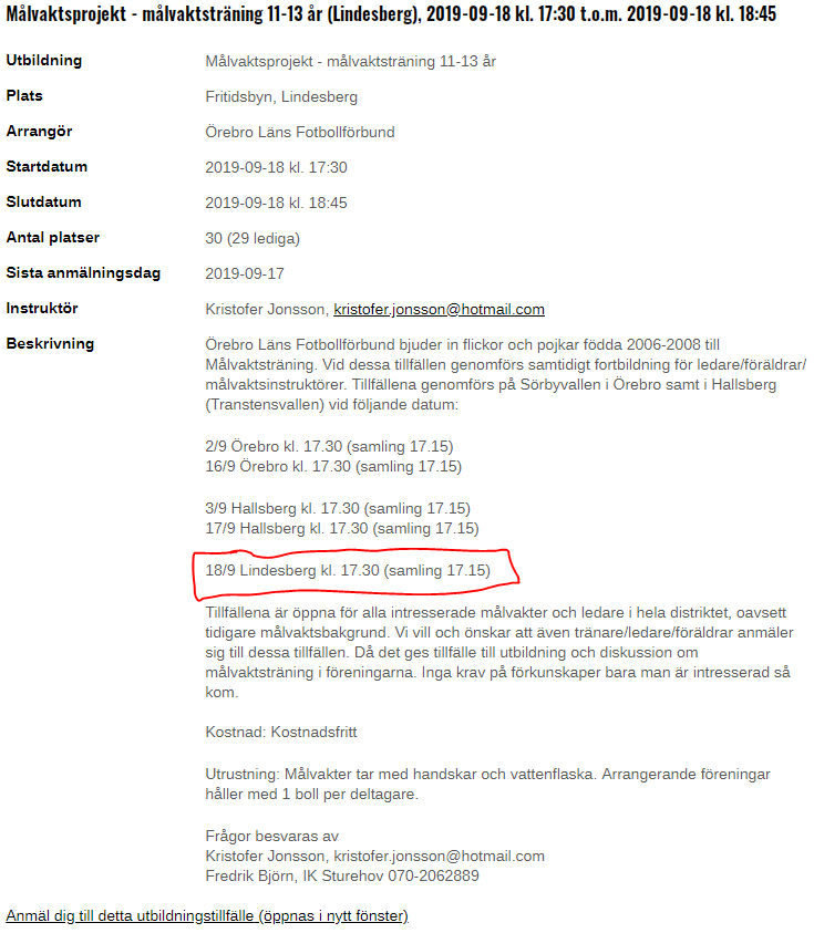 ÖLFF ordnar målvaktsträning för ungdomar födda 2006-2008. Den 18 september i Lindesberg. Det finns även andra tillfällen i Örebro och Hallsberg som man också kan åka på. OBS ! Obligatorisk föranmälan Länk till anmälan längs ned på inbjudan som finns på följande sida: http://www.olff.se/tranarutbildning/anmalan/?scr=info&fiid=45846 Tränaren lägger upp träningen utifrån hur många som är anmälda. IFK Lindesberg F04/07 3 sep 2019 0kommentarer