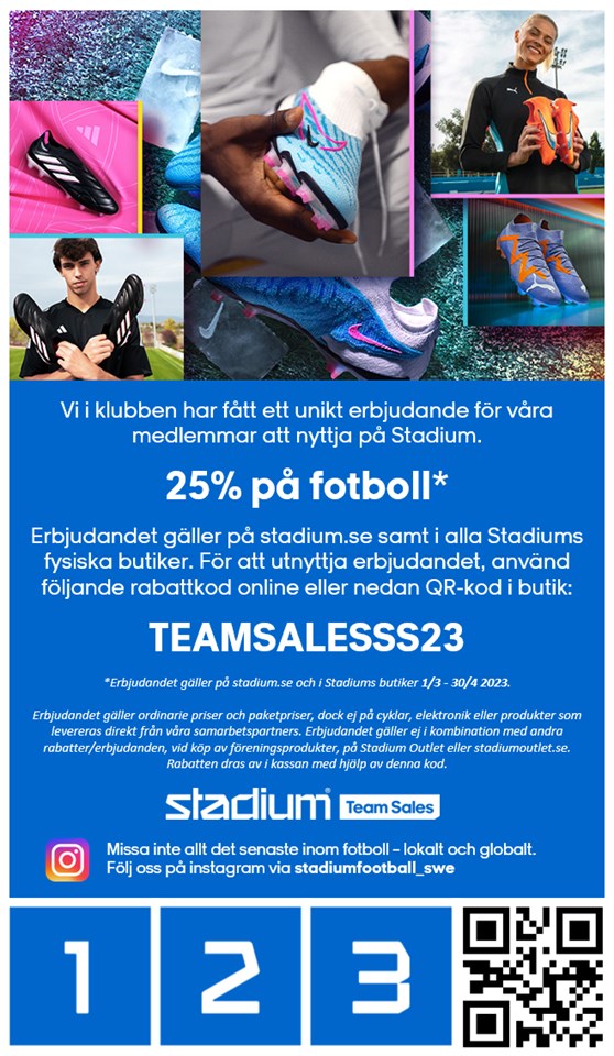 1/3 - 30/4 2023 Erbjuder vår samarbetspartner Stadium 25% rabatt på fotbollsrelaterade produkter. Ange koden i bilden eller visa upp QR koden i bilden när du betalar så sparar du pengar samtidigt som du stöttar IFK Lit som får bonus på ditt köp. PF -2017 1 mar 2023 0kommentarer