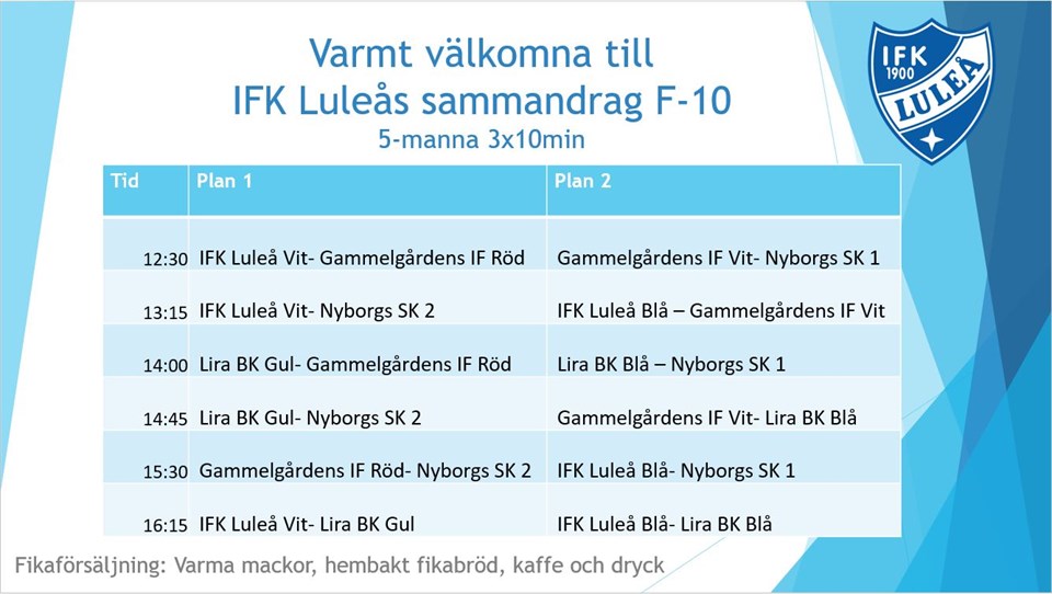 Här kommer spelschemat för vårt sammandrag nu på söndag den 17/6. Vi startar kl. 12:30 och sista matchen slutar ca. kl 16:50. Vi välkomnar gästande lag Lira BK, Nyborgs SK och Gammelgårdens IF. Samtliga ställer upp med två lag var. Eftersom Lira har fotbollsskola fram till kl. 13:00, ansluter dom inte förrän ca. kl. 14:00. Väderprognosen visar på 17 grader och sol, så vi får hoppas att det håller i sig :) Varmt välkomna! /Lagledarna och tränarna
