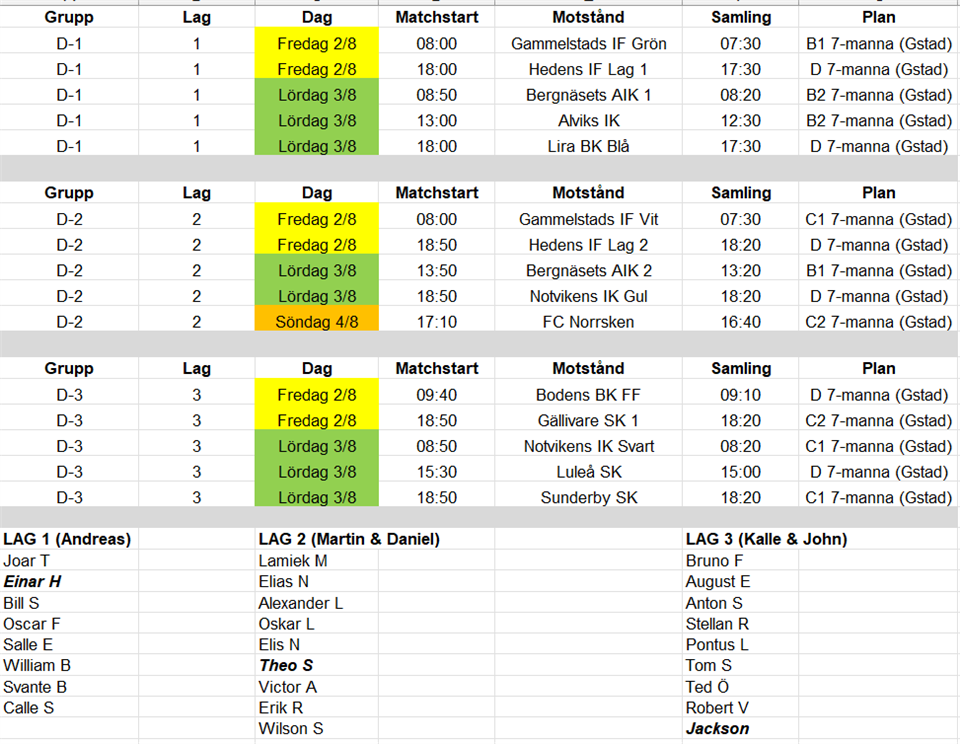 Hej alla, Dags för kommande GIF-cup (2-4/8). Länk till cupens spelschema: Cupinformation Föräldrar/Vårdnadshavare ansvarar för sitt barn mellan matcherna samt att barnet är på plats i tid till samlingstiderna (Se bifogad bild). Senast 30 minuter innan matchstart behöver alla vara på plats. Se till så att alla spelare har med sig: Blå shorts Blå matchtröja Blå strumpor Vit matchtröja Benskydd Fotbollsskor Vattenflaska Blå överdragsbyxor Blå överdragströja Väl mött på fredag. :) P-12 30 jul 2024 0kommentarer