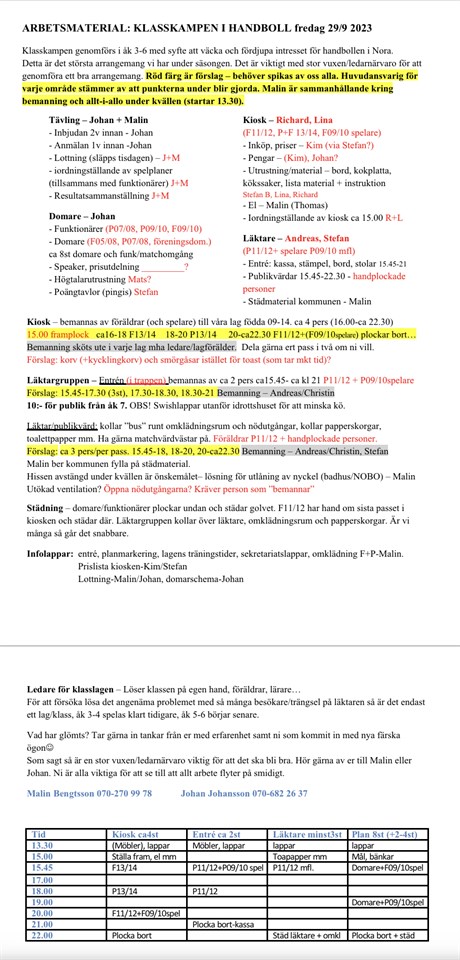 Här kommer information ut till alla ledare kring klasskampen i handboll. Filen ligger under dokument också - mer läsbar. Läs igenom den så att vi alla är insatta i organisationen och sin egen roll. Förmedla sedan aktuell info vidare till era hjälptränare, lagledare, lagföräldrar och liknande som då kan hjälpa till att fixa bemanningen av ert ansvarsområde. Hör av er med frågor, funderingar och förslag. Nu får vi hoppas på samma succé som det brukar vara 😊 Ledare 12 sep 2023 5kommentarer