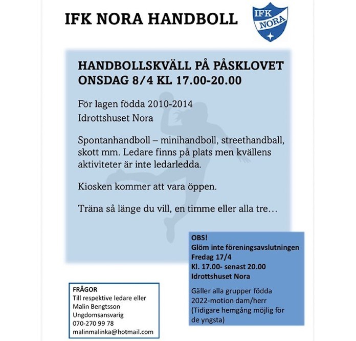 | Gemensam föreningsavslutning IFK Nora Handboll | 17 apr, 17:00 |